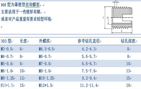 薄壁型洛阳自攻螺套外观上看主要有两种区分,一种是一端开槽型的,另一种是一端三圆孔型的,其中开圆孔型的又分为307型和308型两种,307型和308型外观主要区别就是同一直径下,长度和外径大小有所区分。以上各种型式螺套均具有自行攻牙功能。